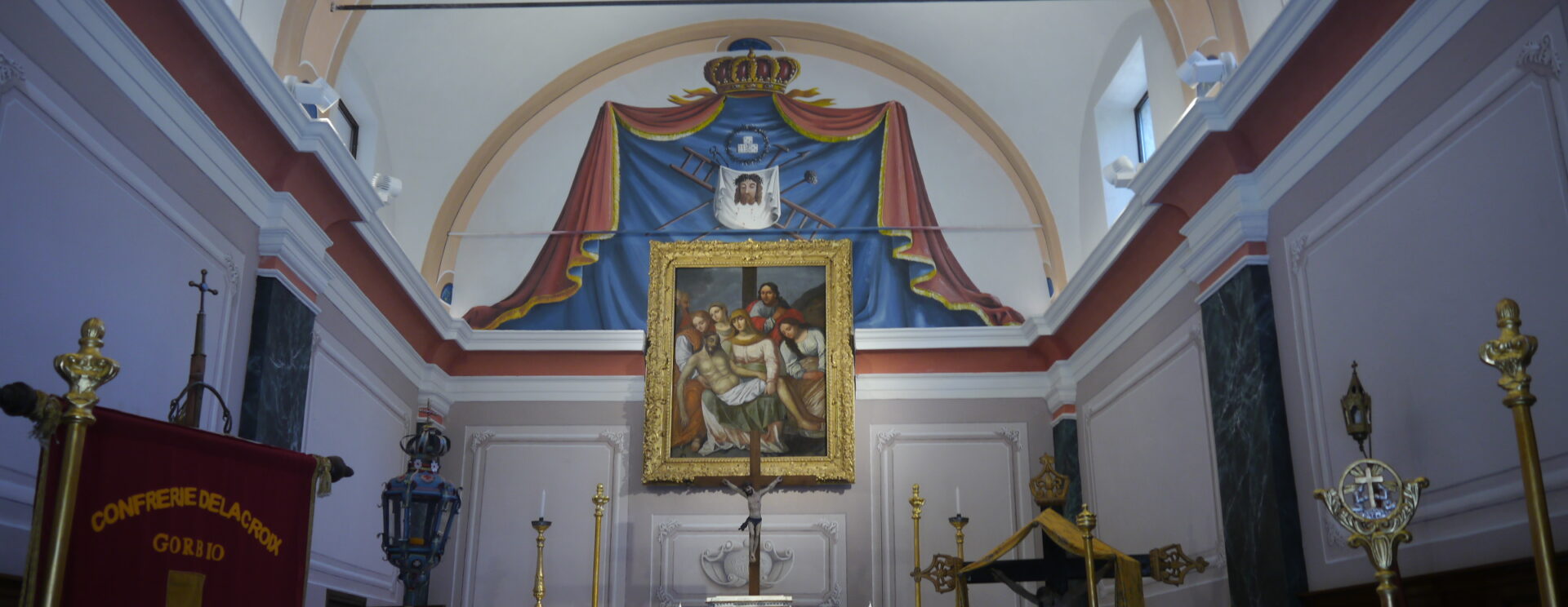 Cette chapelle fut construite en 1445, les pénitents blancs de la Sainte-Croix eurent très tôt un rôle humanitaire dans les petites communautés isolées comme le fut Gorbio, village en cul-de-sac qui vécut un peu coupé du monde jusqu’entre les deux guerres.